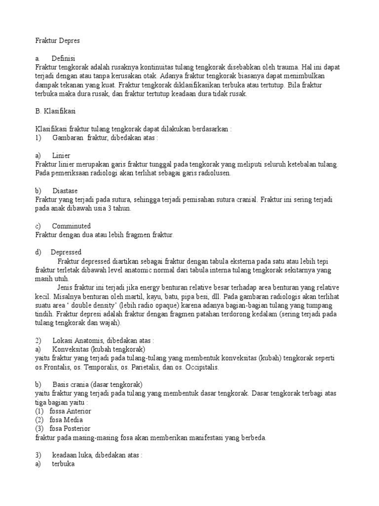 Hubungan Cedera Servikal Dengan Fraktur Depresi Tulang Frontal Pada Cedera Kepala Ringan from data03.123doks.com Fraktur depresi (patah tulang tengkorak cekung) dinamakan fraktur depresi, karena terdapat bagian patahan tulang yang terdorong ke dalam rongga otak, membentuk cekungan. Terjemahan dari depresi di bahasa inggris. Fraktur adalah terputusnya kontuinitas tulang dan ditentukan sesuai jenis dan luasnya, fraktur terjadi jika tulang dikenai stress yang lebih besar dari yang dapat diabsorbsinya (smelter & bare, 2002). Sebenarnya, apa yang dimaksud dengan depresi? Dinamakan seperti ini untuk menggambarkan adanya fragmen patahan yang terdorong kedalam rongga otak. Gejala lainnya yang berhubungan adalah depresi, gangguan cemas selain daripada memeriksa tanda kegawatdaruratan dan gcs, tanda adanya cedera kepala lain seperti fraktur atau laserasi. Biasanya disertai dengan perpindahan posisi tulang. Depression is a medical illness.